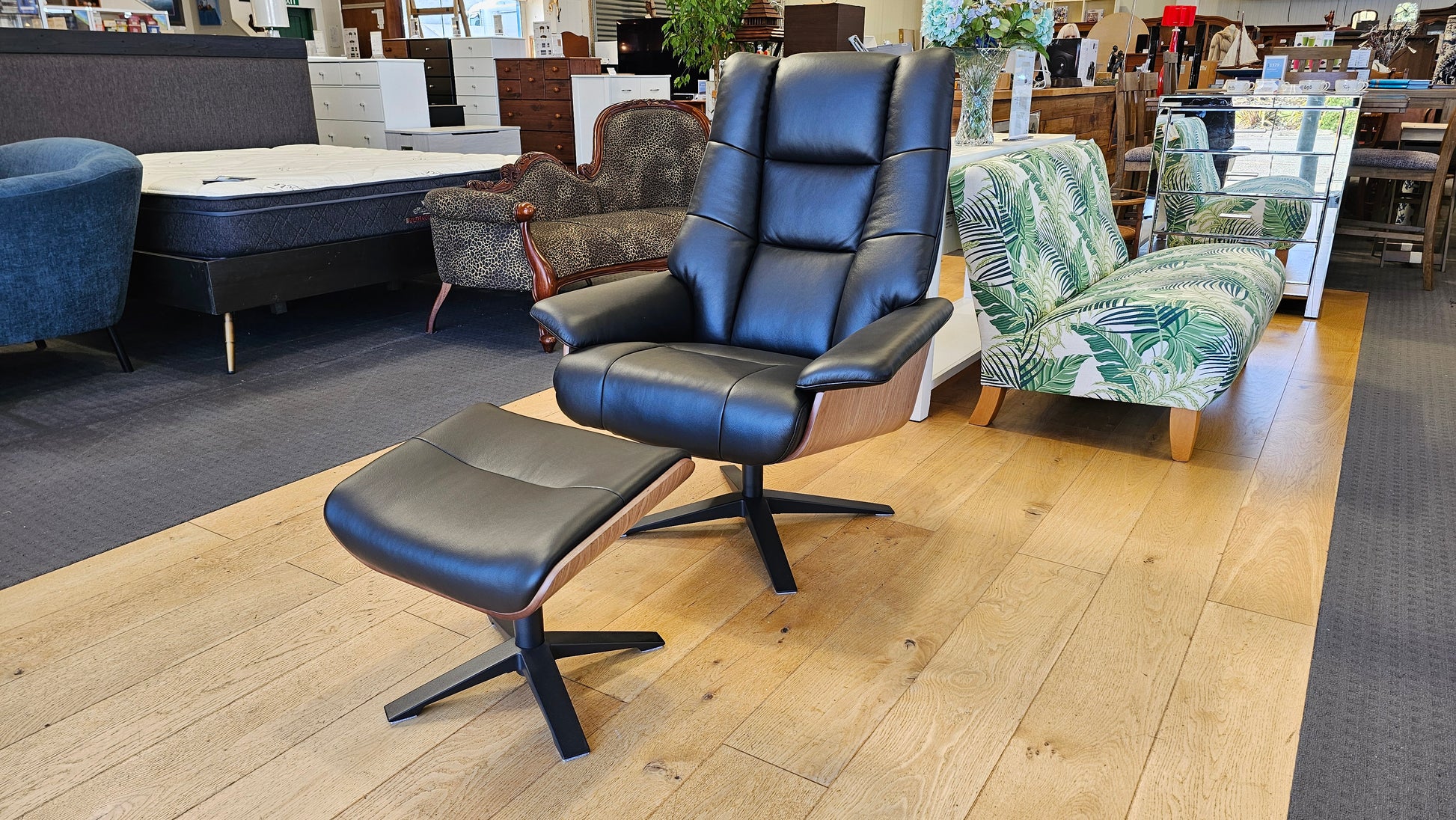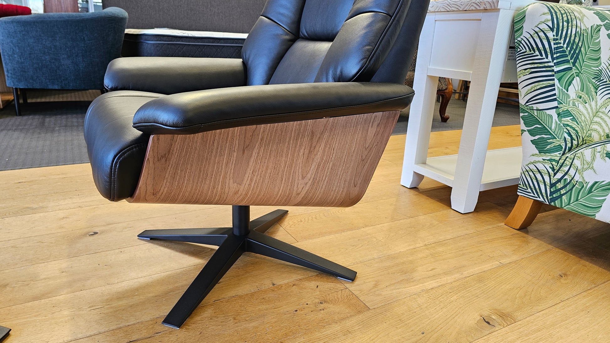 Supple leather and stylish design, introducing the Hampton Leather Recliner and Foot Stool. Full recline and 360 degree swivel.