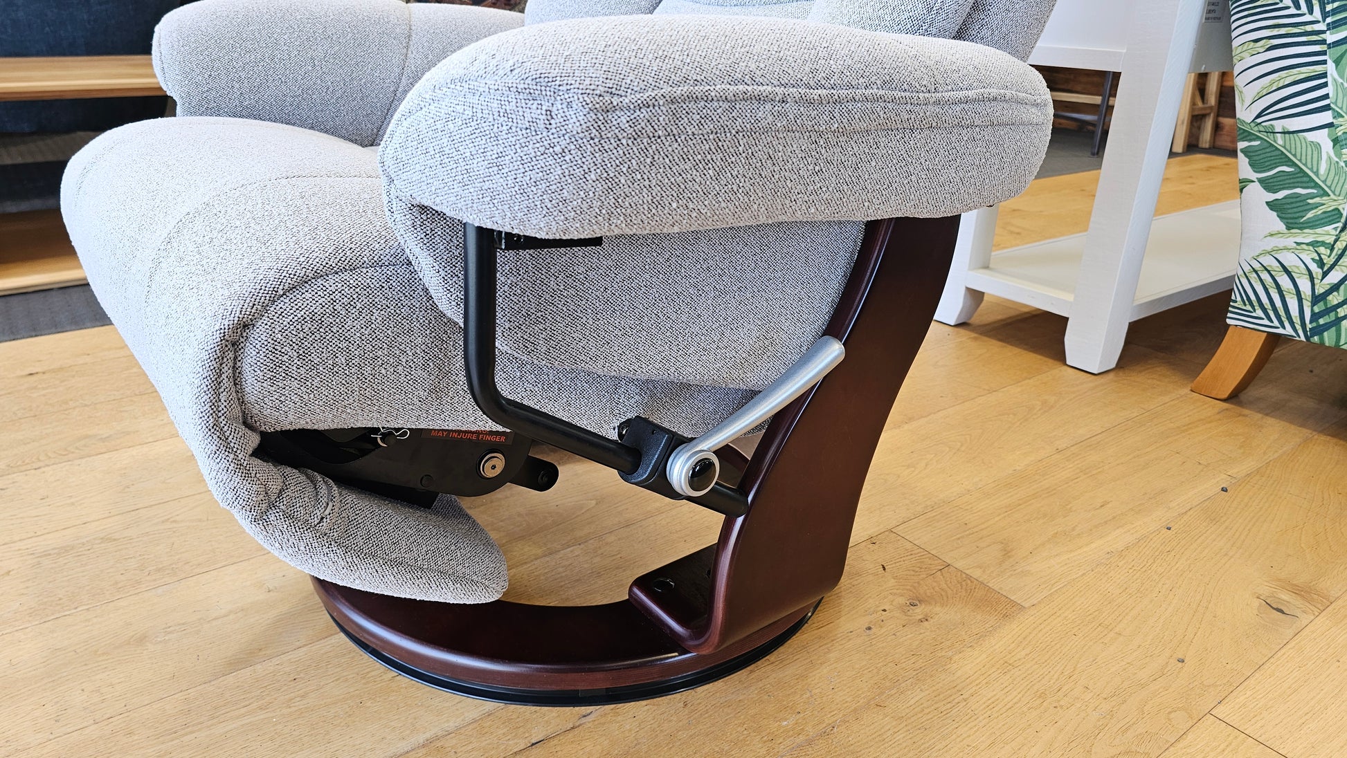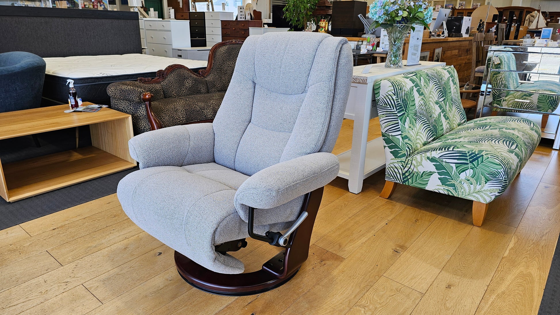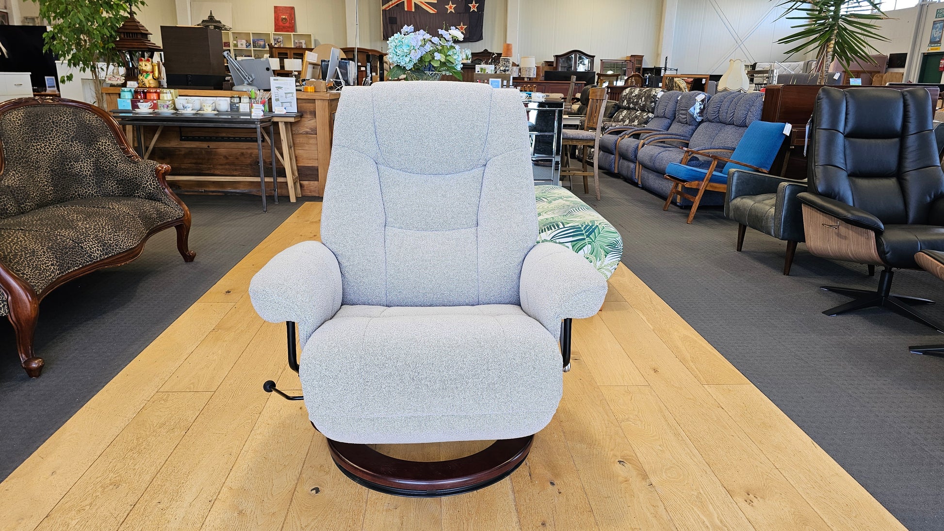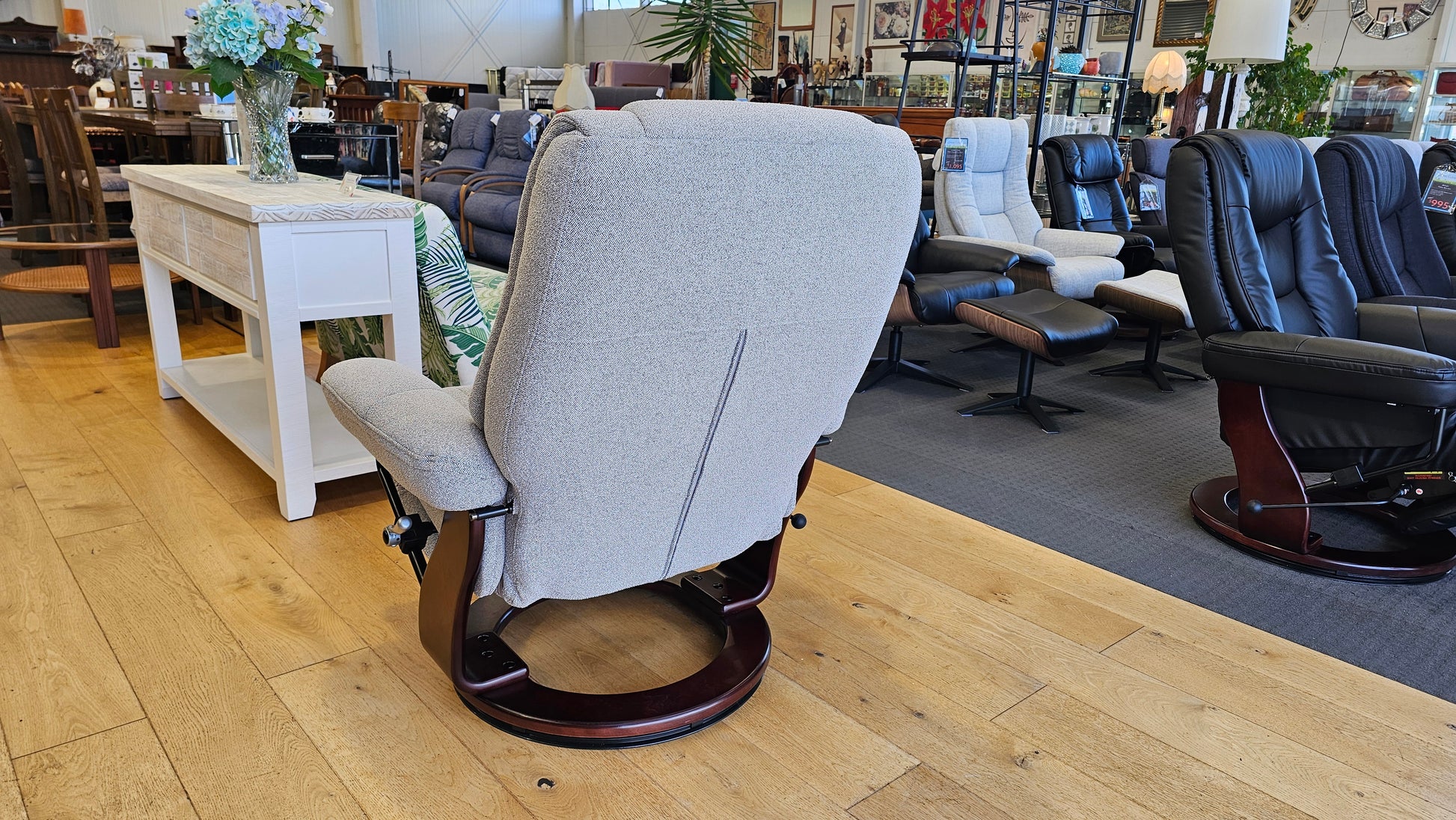 A comfortable recliner with integrated foot rest. Full recline and 360 degree swivel.